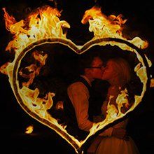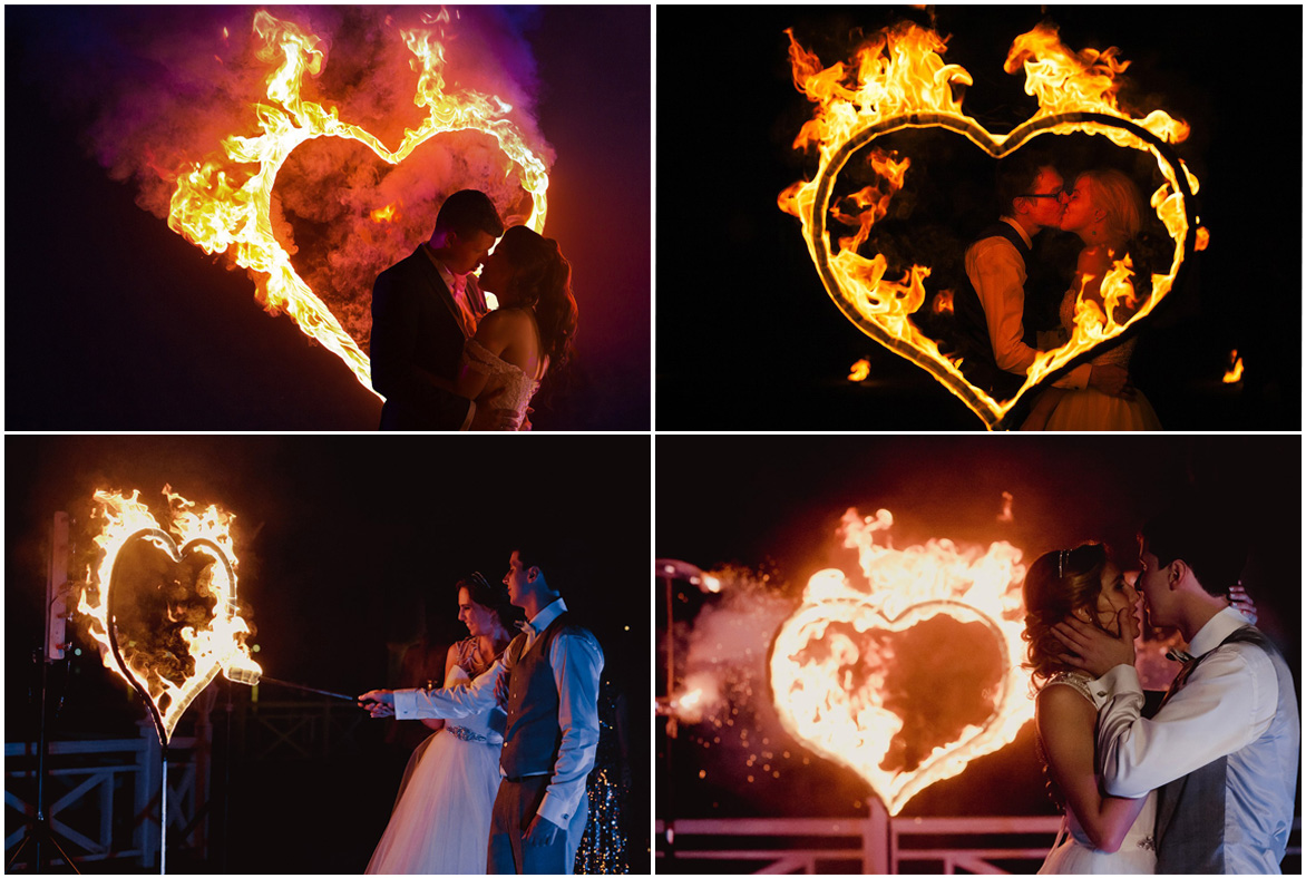 Да, достаточно часто мы проводим шоу, где в фонограмму включена песня молодоженов. Самый простой вариант – мы запускаем определенный трек, когда жених и невеста, а теперь уже муж и жена, зажигают огненное сердце. Это очень трогательная и яркая церемония! А еще после нее все желающие могут сфотографироваться на фоне живого огня.
